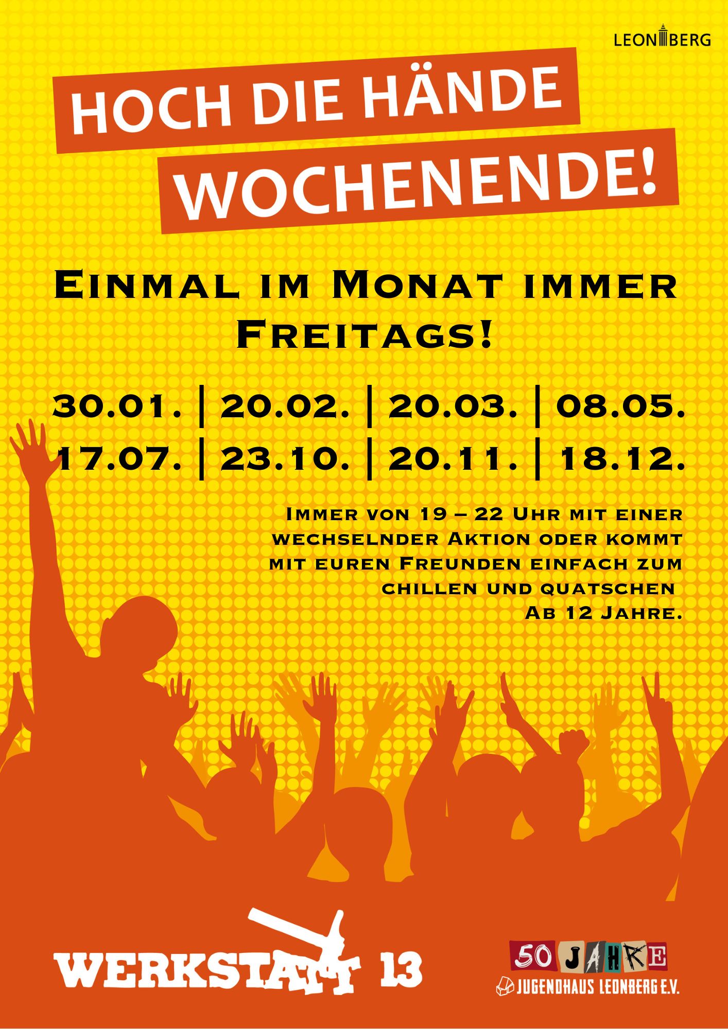 - "Hoch die Hände, Wochenende!" – Einmal im Monat freitags von 19-22 Uhr starten wir ins Wochenende mit coolen Aktionen, Musik und chilliger Atmosphäre.
